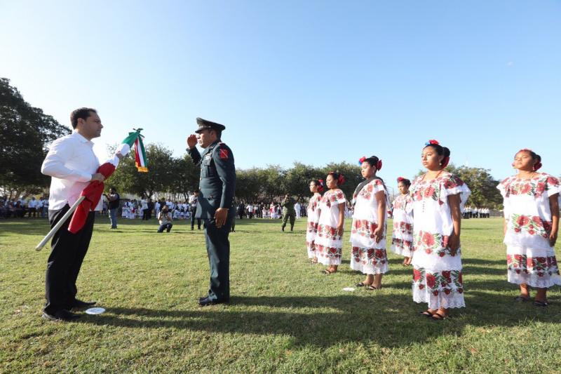Mérida, Yucatán, 24 de febrero de 2019.- El Gobernador Mauricio Vila Dosal presidió este día la ceremonia conmemorativa al 198 aniversario del Día de la Bandera, en la que se recordó que este símbolo patrio enaltece los ideales e identidad de México, a la vez que nos da la fuerza para continuar en la lucha diaria que llevan todos los habitantes del estado y del país.