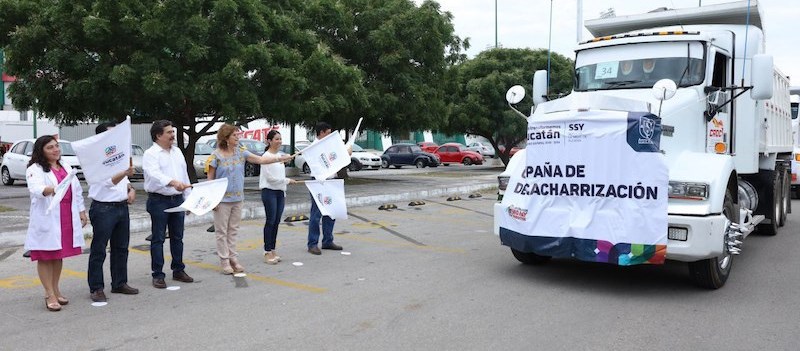 Desde el estacionamiento de la Unidad Deportiva Kukulkán, la funcionaria estatal encabezó el despliegue de alrededor de 445 volquetes que se pusieron a disposición para recorrer las 263 colonias y comisarías aledañas, comenzando este sábado 7 en el sur de Mérida y domingo 8 en la zona norte y cerrará los días 14 y 15 en las comisarías y sitios aledaños a la ciudad.