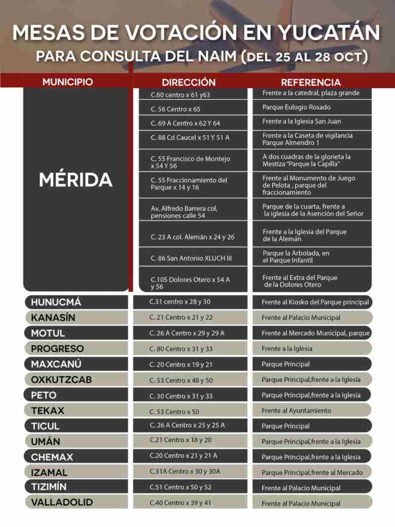 En los municipios del interior del estado las mesas de consulta se ubicarán en los parques principales del centro, en Valladolid (calle 40 por 39 y 41), Tizimín (calle 51 por 61 y 63), Izamal (calle 31a por 30 y 30a), Chemax (calle 20 por 21 y 21a), Umán (calle 21 por 18 y 20), Ticul (calle 26a por 25 y 25a), Tekax (calle 53 por 60), Peto (calle 30 por 31 y 33), Oxkutzcab (calle 53 por 48 y 50), Maxcanú (calle 20 por 19 y 21), Progreso (calle 80 por 31 y 33), Motul (calle 26a por 29 y 29a), Kanasín (calle 21 por 20 y 22) y Hunucmá (calle 31 por 28 y 30).