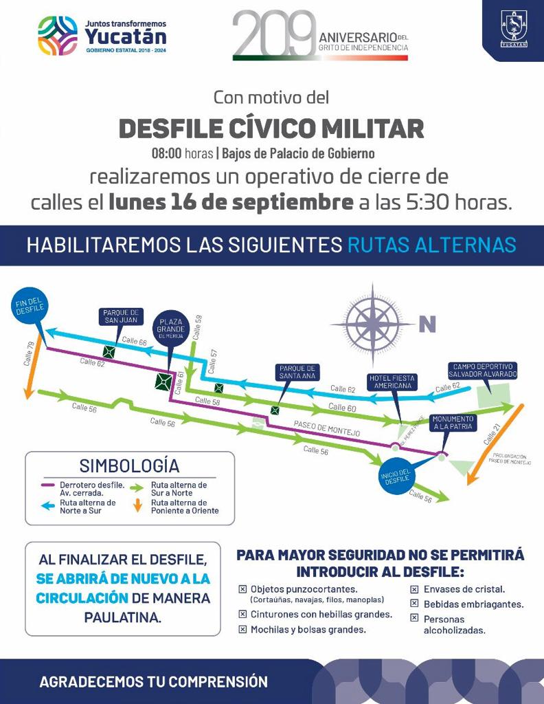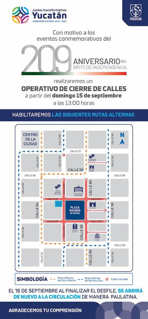 De acuerdo con lo planeado, para el domingo 15 de septiembre se cerrarán a la circulación de vehículos las calles 63 con 60, 61 con 60, 62 con 63 y 61 con 62, es decir, las que rodean a la Plaza Grande, quedando como rutas alternas para la circulación, de norte a sur, la calle 62 hasta llegar a su cruce con la 57 para luego incorporarse a la 66 y continuar el trayecto. De sur a norte se podrá circular por la calle 60 hasta su cruce con la 65, continuar sobre ésta hasta el entronque con la 64 y llegar a la intersección con la 59 para incorporarse de nuevo a la 60.